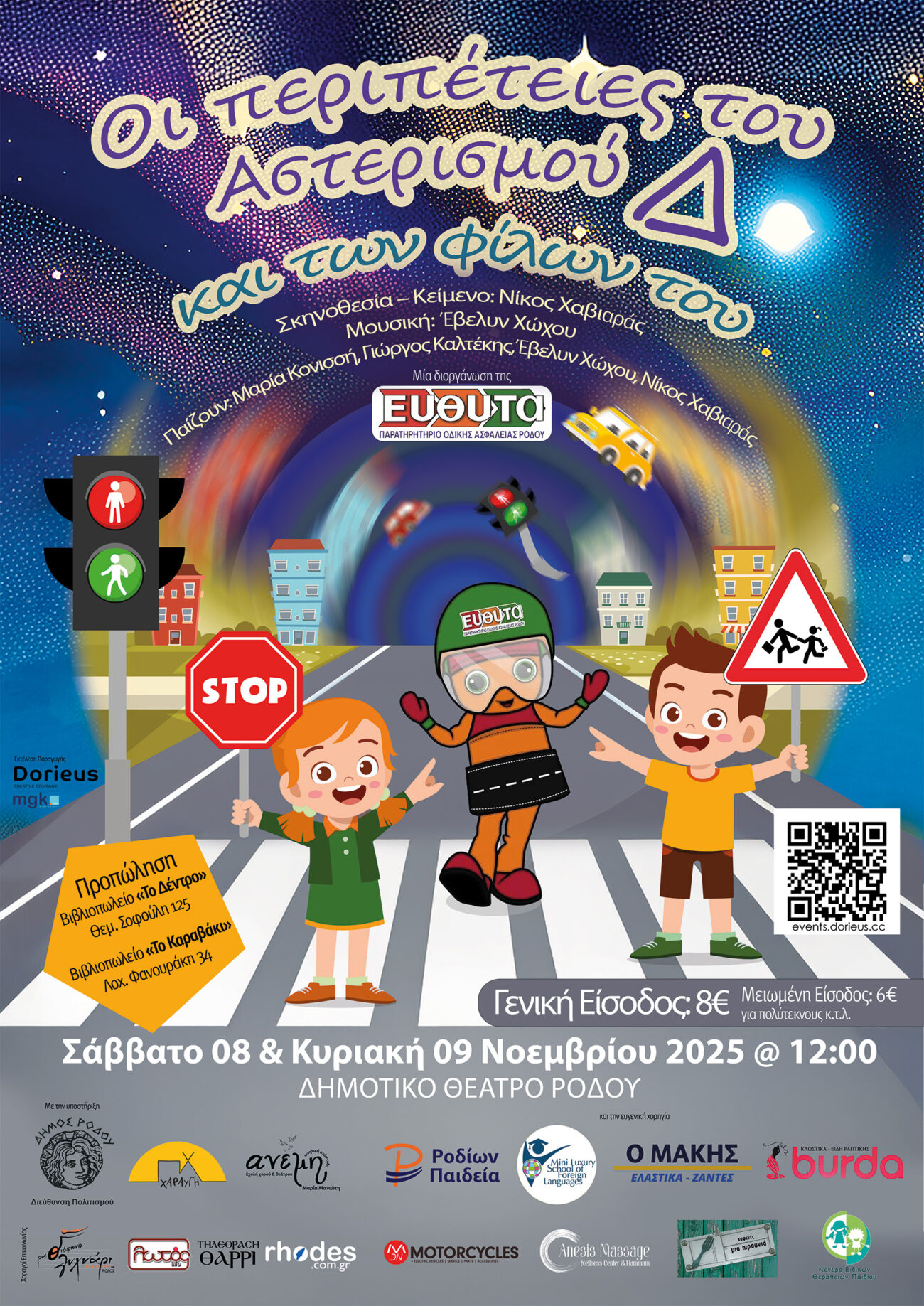 Μια ξεχωριστή θεατρική παράσταση που συνδυάζει τη διασκέδαση με την εκπαίδευση παρουσιάζει η ΕΥΘΥΤΑ ΡΟΔΟΥ – Παρατηρητήριο Οδικής Ασφάλειας, με στόχο να μυήσει μικρά και μεγάλα παιδιά στον κόσμο της οδικής ασφάλειας μέσα από το παιχνίδι, το τραγούδι και τη συμμετοχή!