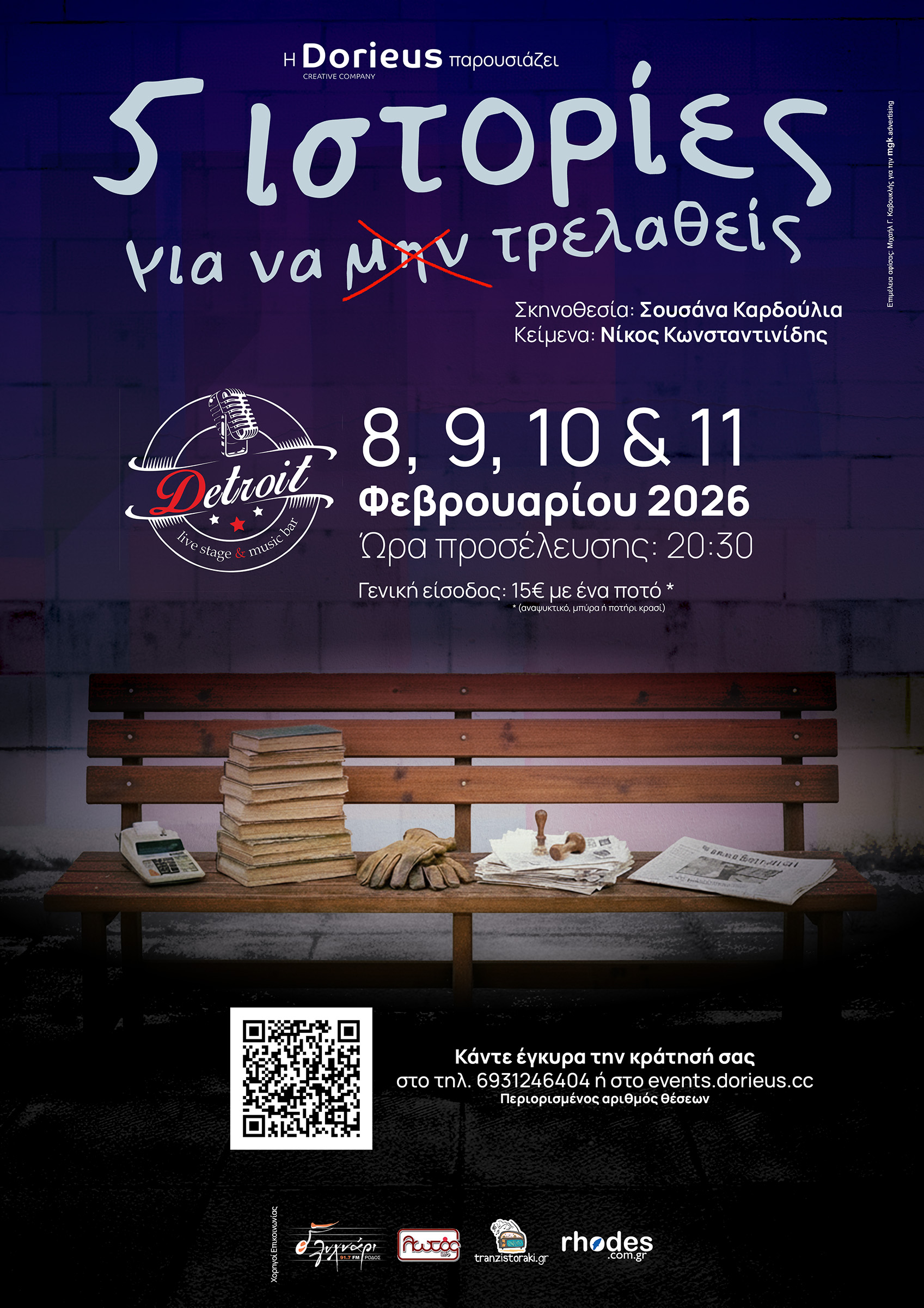 Η Dorieus Creative Company παρουσιάζει τη θεατρική παράσταση «5 ιστορίες για να (μην) τρελαθείς», σε σκηνοθεσία Σουσάνας Καρδούλια και κείμενο Νίκου Κωνσταντινίδη, για τέσσερις μοναδικές παραστάσεις στο Detroit Live Stage & Music Bar (Καποδιστρίου 20, Ρόδος), στις 8, 9, 10 και 11 Φεβρουαρίου 2026.