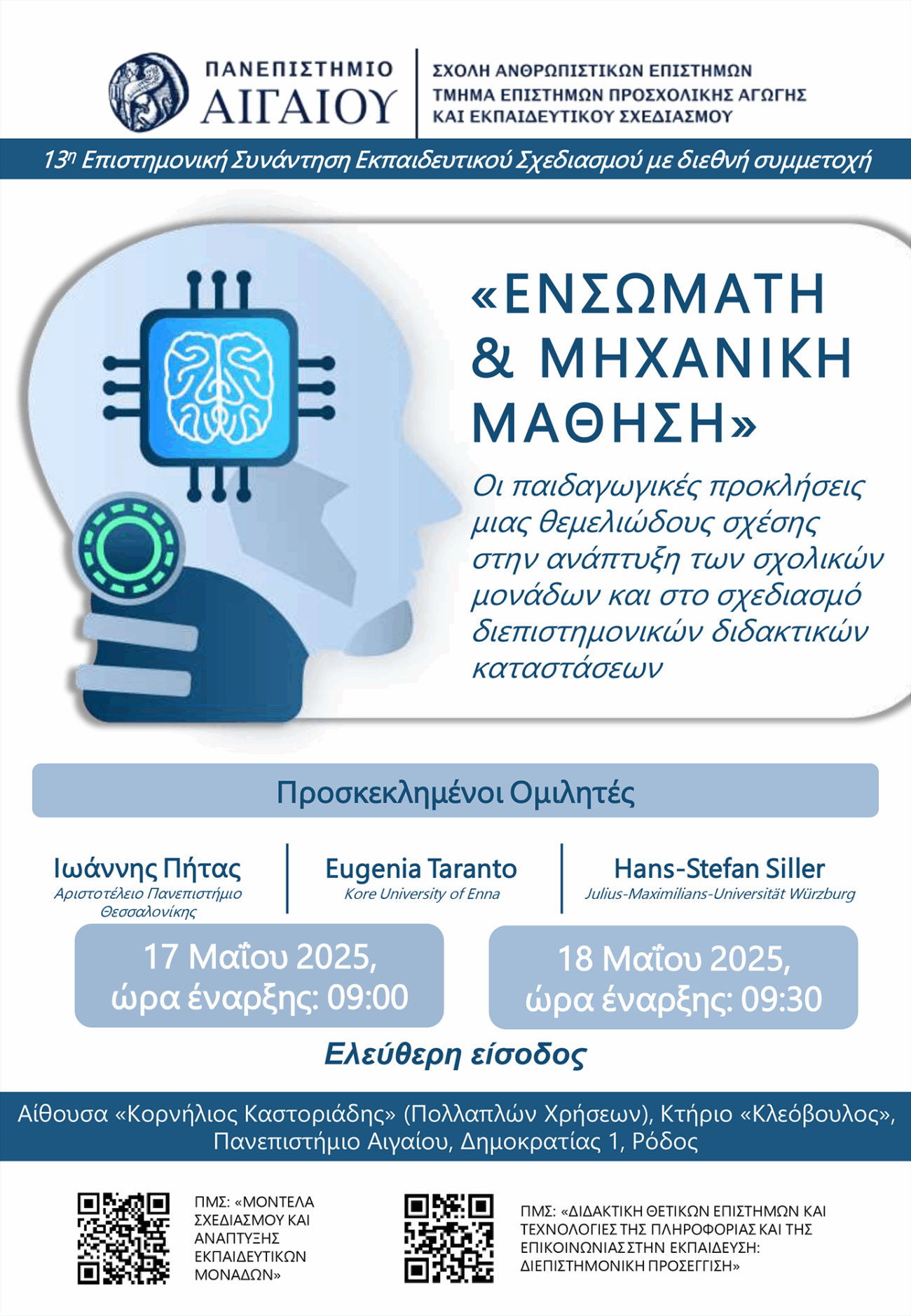 Κείμενο: Σας προσκαλούμε στη 13η Επιστημονική Συνάντηση Εκπαιδευτικού Σχεδιασμού με διεθνή συμμετοχή, με θέμα «Ενσώματη και Μηχανική Μάθηση: οι Παιδαγωγικές Προκλήσεις μιας Θεμελιώδους Σχέσης στην Ανάπτυξη των Σχολικών Μονάδων και στο Σχεδιασμό Διεπιστημονικών Διδακτικών Καταστάσεων» που θα πραγματοποιηθεί στη Ρόδο 17 & 18 Μαΐου 2025 στο Πανεπιστήμιο Αιγαίου, Λεωφόρος Δημοκρατίας 1, κτήριο Κλεόβουλος, αίθουσα Κορνήλιος Καστοριάδης.